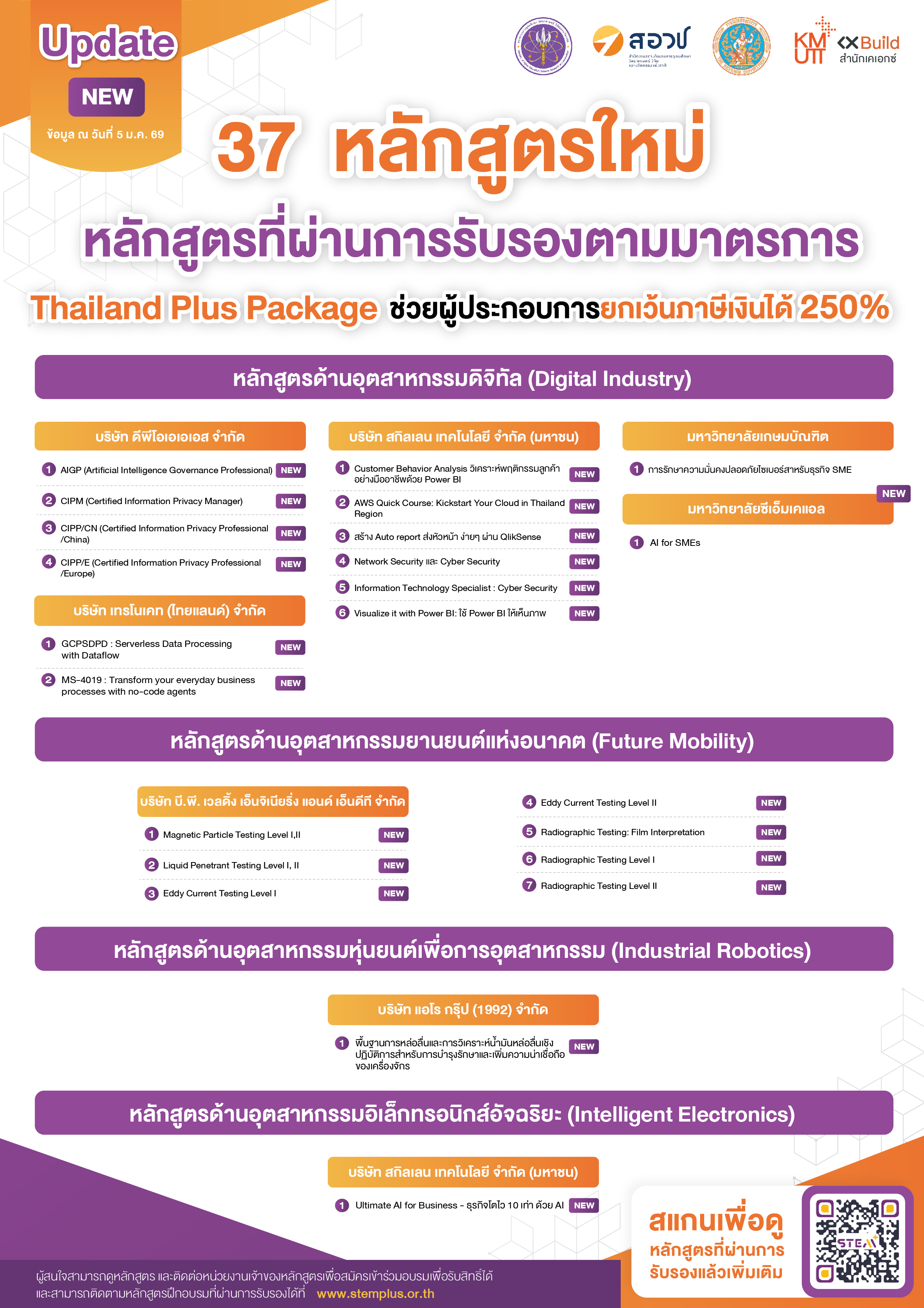 หลักสูตรเหล่านี้เป็นหลักสูตรจากหน่วยฝึกอบรมภาคเอกชนที่น่าสนใจหลากหลายแห่ง ที่ได้รับการรับรอง ตามมาตรการ Thailand Plus Package มุ่งเน้นการฝึกอบรมเพื่อพัฒนาบุคลากรด้าน STEM ที่สอดคล้องกับความต้องการทักษะบุคลากรสำหรับอุตสาหกรรมเป้าหมาย (Future Skills Set) ซึ่งผู้ประกอบการสามารถนำค่าใช้จ่ายในการส่งบุคลากรเข้าอบรมในหลักสูตร ไปขอยกเว้นภาษีเงินได้จากกรมสรรพากรได้ถึง 250%