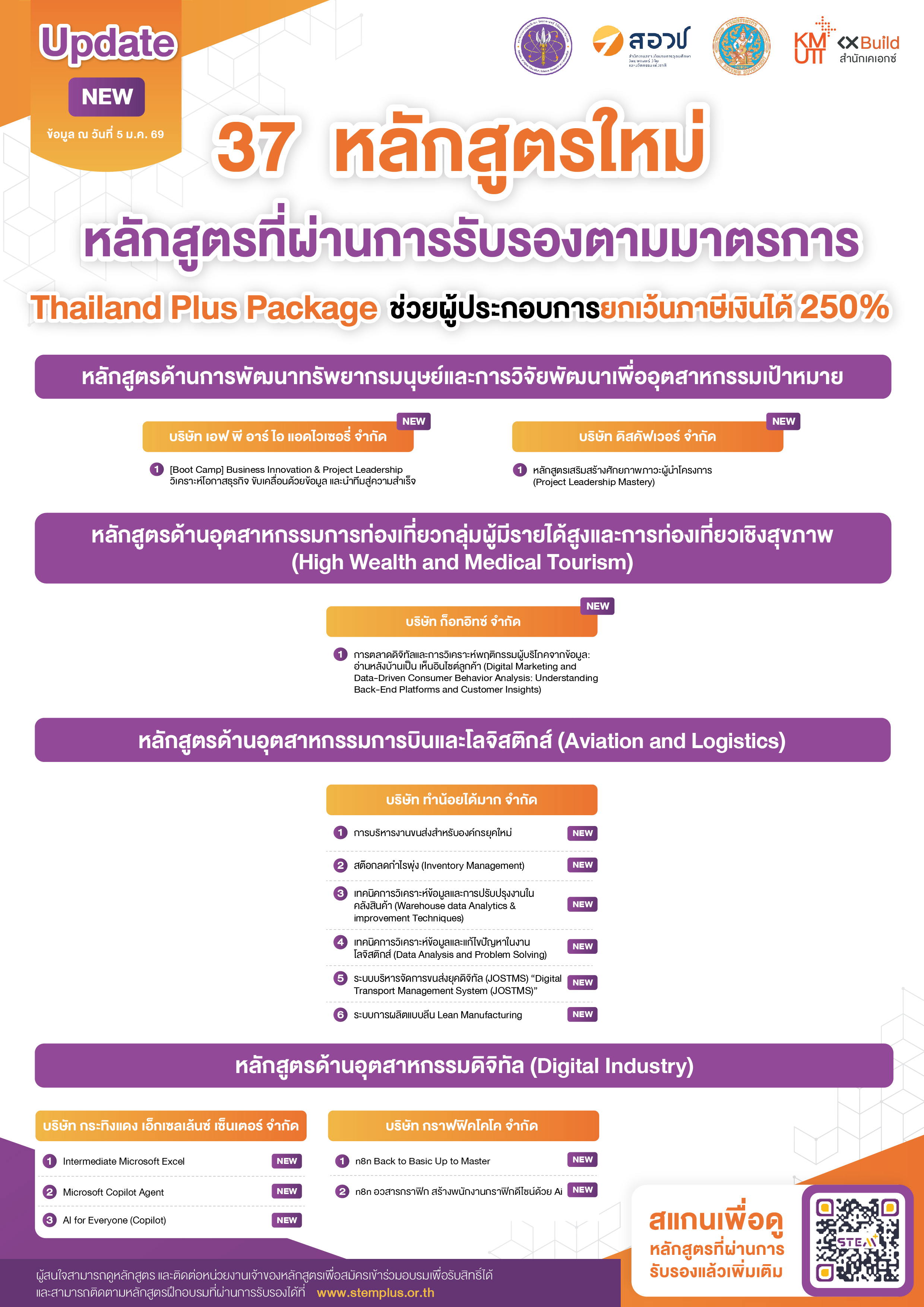 กระทรวง อว. โดย สอวช. รับรอง 37 หลักสูตรใหม่ ในการพัฒนาบุคลากรด้านสะเต็ม ประจำเดือนมกราคม 2569 พร้อมมอบสิทธิประโยชน์ให้ผู้ประกอบการยกเว้นภาษีได้มากถึง 250% เตรียมพร้อมส่งบุคลากรเข้ามาพัฒนาทักษะกันได้เลย!