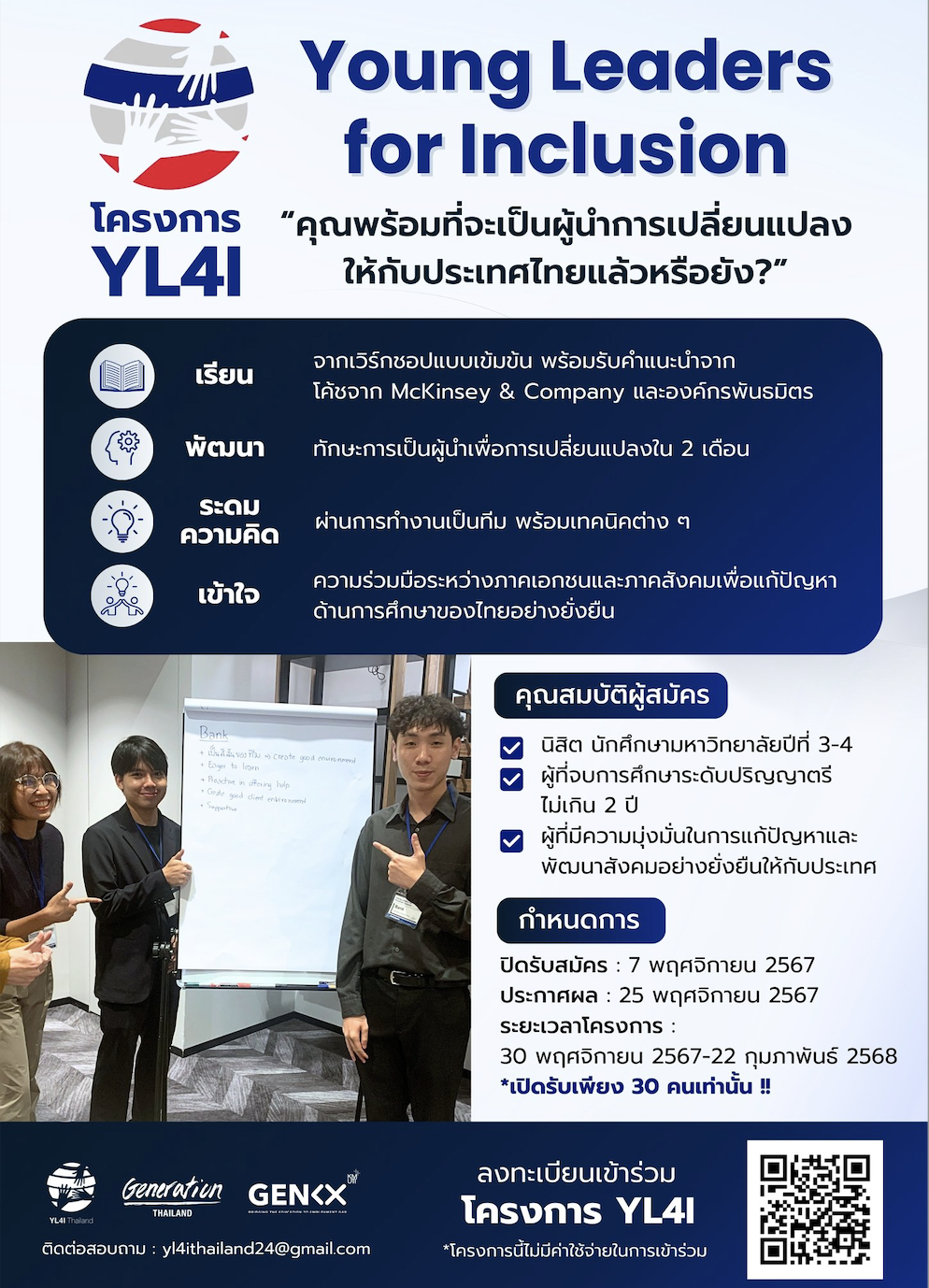 เปิดรับสมัครแล้ว!! โครงการ Youth Leaders for Inclusion (YL4I) รุ่นที่ 2 โดยองค์กรเจเนเรชั่น ประเทศไทย และสำนักเคเอกซ์ มหาวิทยาลัยเทคโนโลยีพระจอมเกล้าธนบุรี ด้วยความร่วมมือจากเหล่ากูรูจาก McKinsey & Company