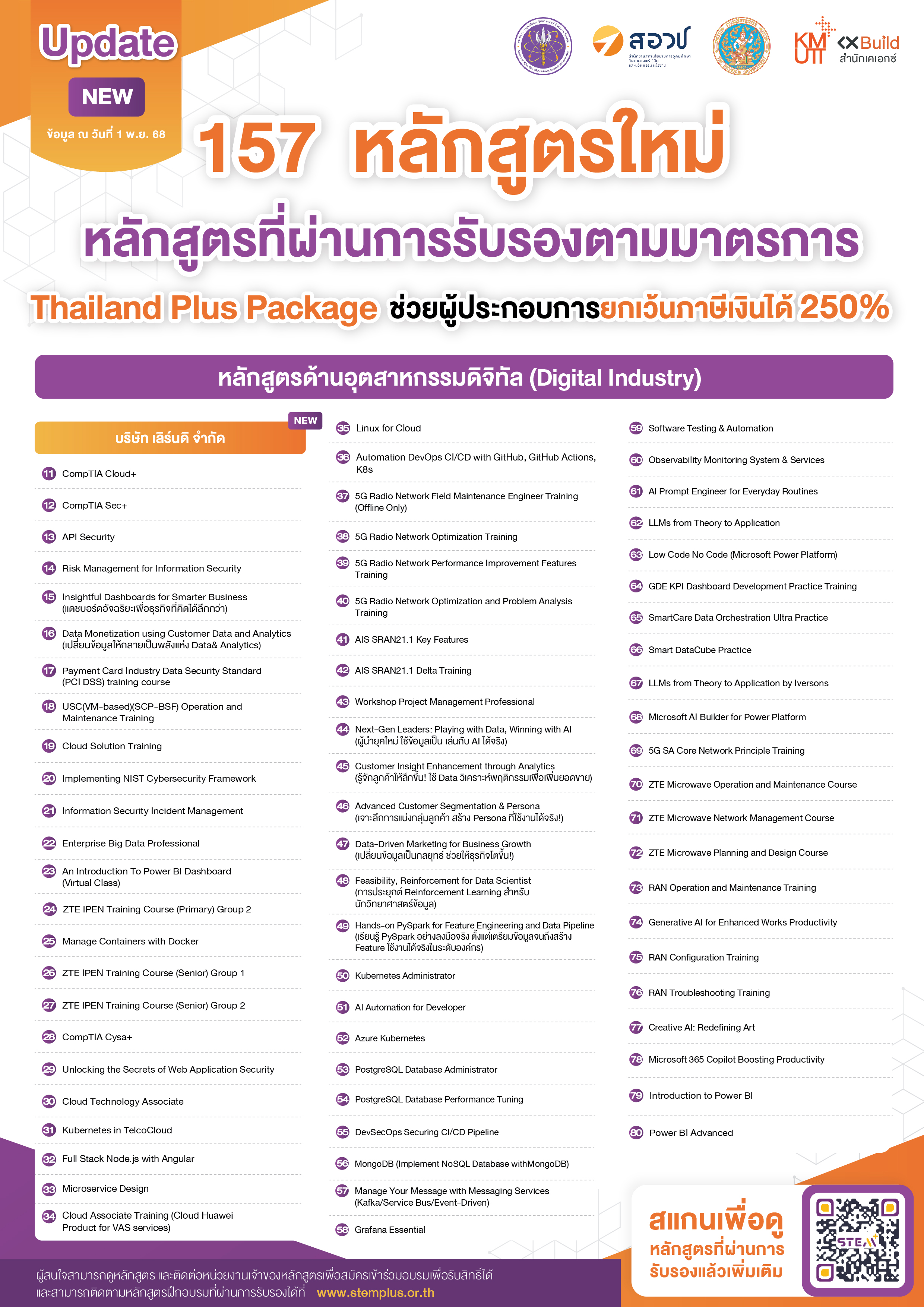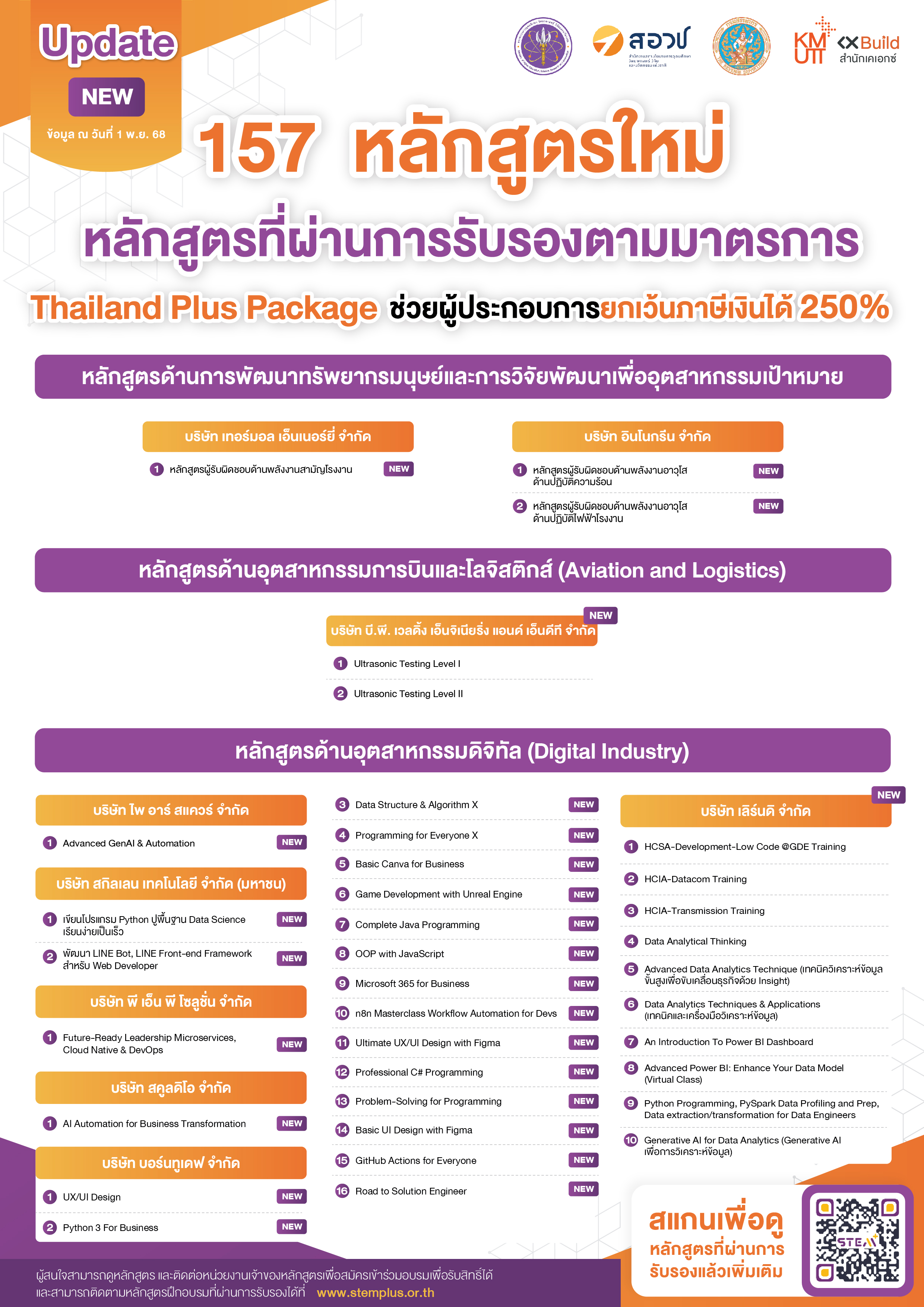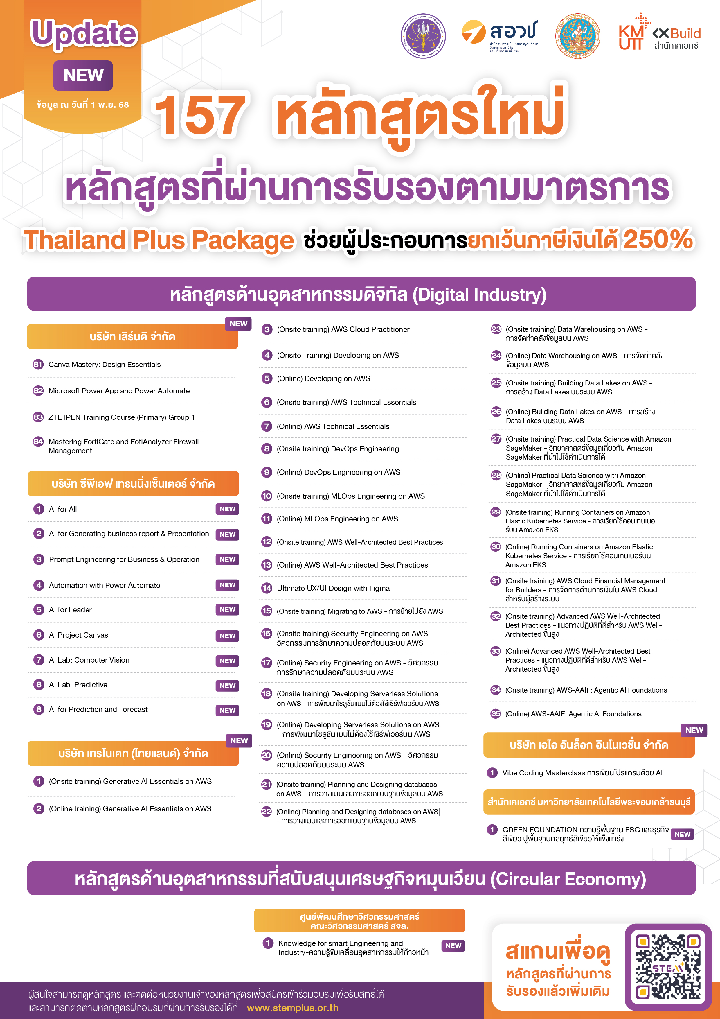 หลักสูตรเหล่านี้เป็นหลักสูตรจากหน่วยฝึกอบรมภาคเอกชนที่น่าสนใจหลากหลายแห่ง ที่ได้รับการรับรอง ตามมาตรการ Thailand Plus Package มุ่งเน้นการฝึกอบรมเพื่อพัฒนาบุคลากรด้าน STEM ที่สอดคล้องกับความต้องการทักษะบุคลากรสำหรับอุตสาหกรรมเป้าหมาย (Future Skills Set) ซึ่งผู้ประกอบการสามารถนำค่าใช้จ่ายในการส่งบุคลากรเข้าอบรมในหลักสูตร ไปขอยกเว้นภาษีเงินได้จากกรมสรรพากรได้ถึง 250%