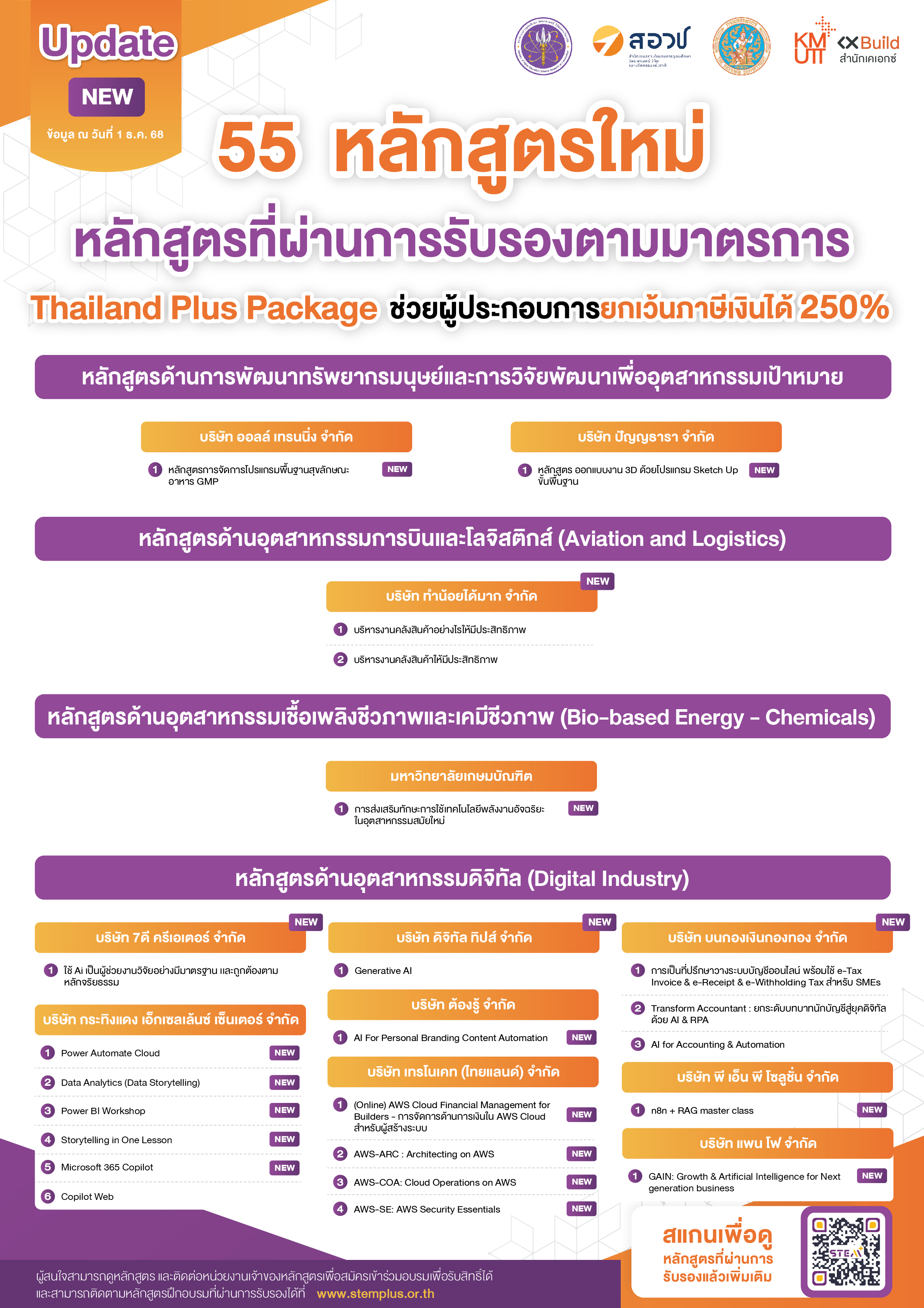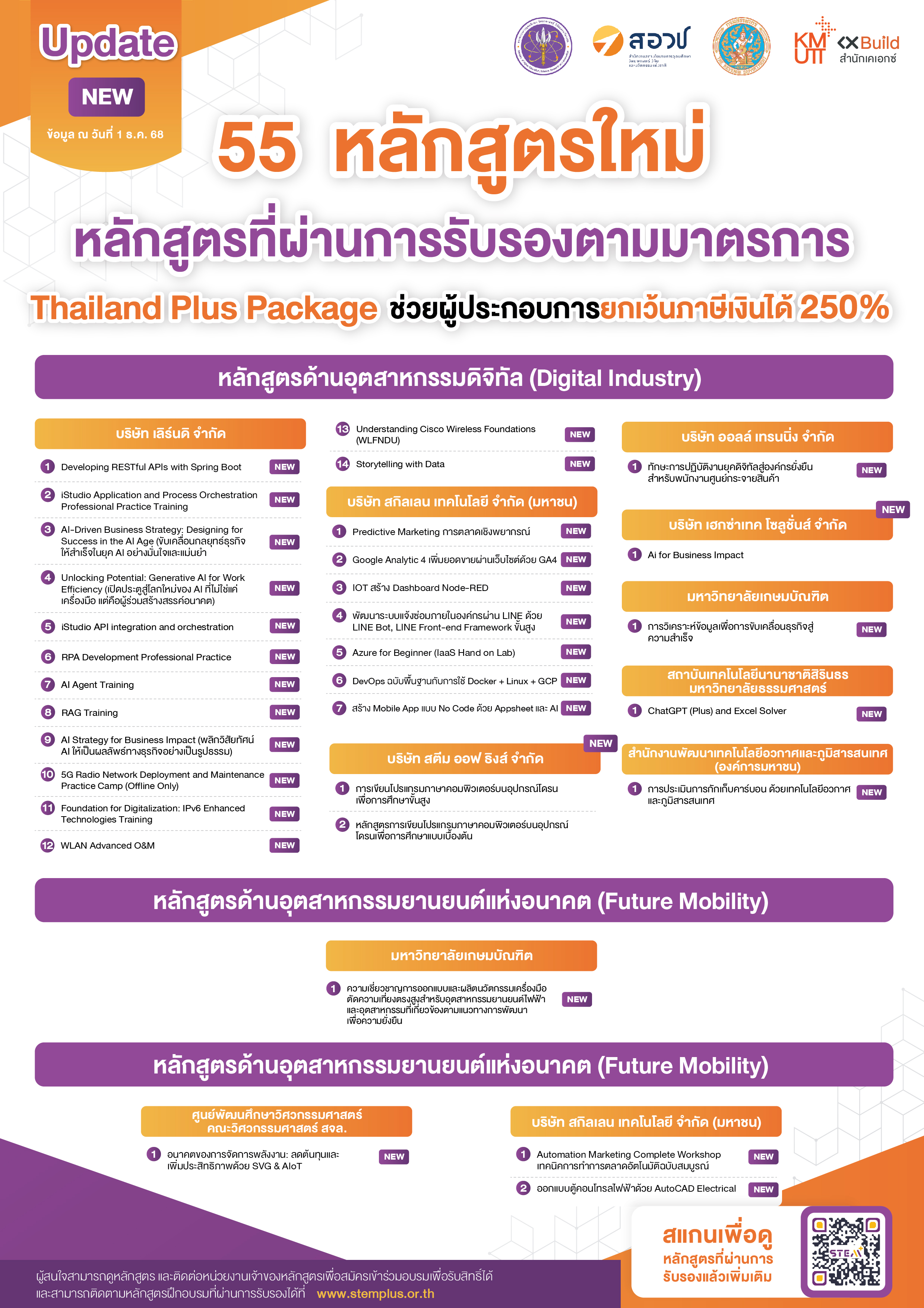 หลักสูตรเหล่านี้เป็นหลักสูตรจากหน่วยฝึกอบรมภาคเอกชนที่น่าสนใจหลากหลายแห่ง ที่ได้รับการรับรอง ตามมาตรการ Thailand Plus Package มุ่งเน้นการฝึกอบรมเพื่อพัฒนาบุคลากรด้าน STEM ที่สอดคล้องกับความต้องการทักษะบุคลากรสำหรับอุตสาหกรรมเป้าหมาย (Future Skills Set) ซึ่งผู้ประกอบการสามารถนำค่าใช้จ่ายในการส่งบุคลากรเข้าอบรมในหลักสูตร ไปขอยกเว้นภาษีเงินได้จากกรมสรรพากรได้ถึง 250%