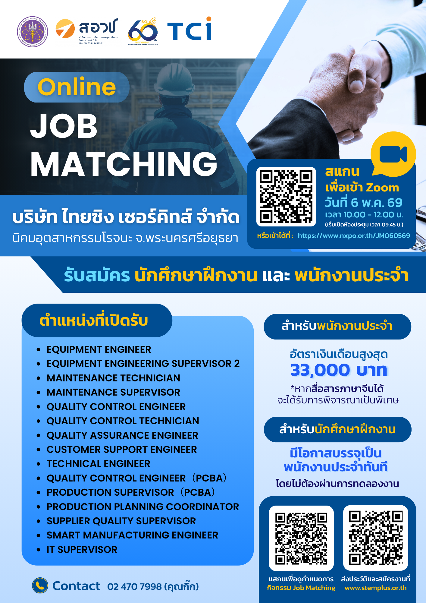 สำนักงานคณะกรรมการส่งเสริมวิทยาศาสตร์ วิจัยและนวัตกรรม (สอวช.) ร่วมกับ BOI และ บริษัท ไทยซิง เซอร์กิตส์ จำกัด ขอเชิญผู้สนใจเข้าร่วมกิจกรรม Online Job Matching กับ บริษัท ไทยซิง เซอร์กิตส์ จำกัด ซึ่งเป็นบริษัทในภาคอุตสาหกรรมอิเล็กทรอนิกส์ เพื่อเปิดโอกาสในการสมัครงานและนักศึกษาฝึกงาน